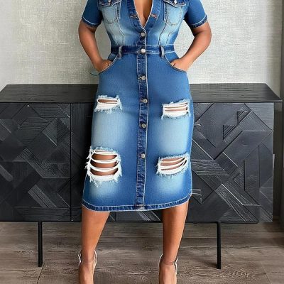 Women Casual Plain Ripped Shirt Collar Knee Length Denim Dress | Denim Dresses