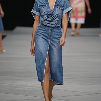 Women Denim Urban Color Block Dolman Sleeve 3D Floral Boat Neck Midi Dress | Denim Dresses