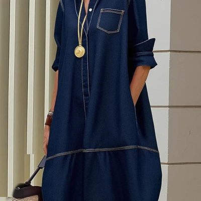 Women Urban Plain Shirt Collar Knee Length Denim Dress | Denim Dresses