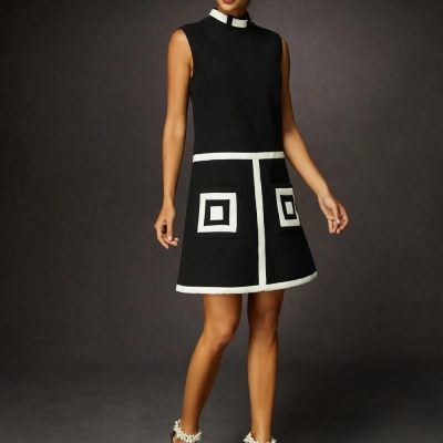 Women Urban Color Block Stand Collar Knee Length Sleeveless Dress | Little Black Dresses