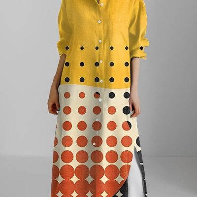 Women Casual Geometric Printing Shirt Collar Midi Dress | Shirt Dresses