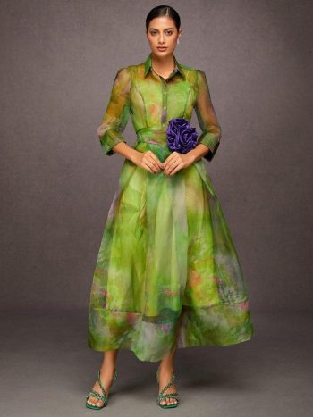 Women Elegant Abstract Print Maxi Dress With Floral Belt | Shirt Dresses