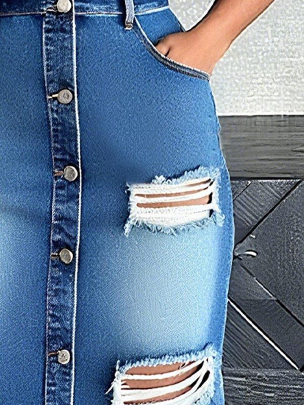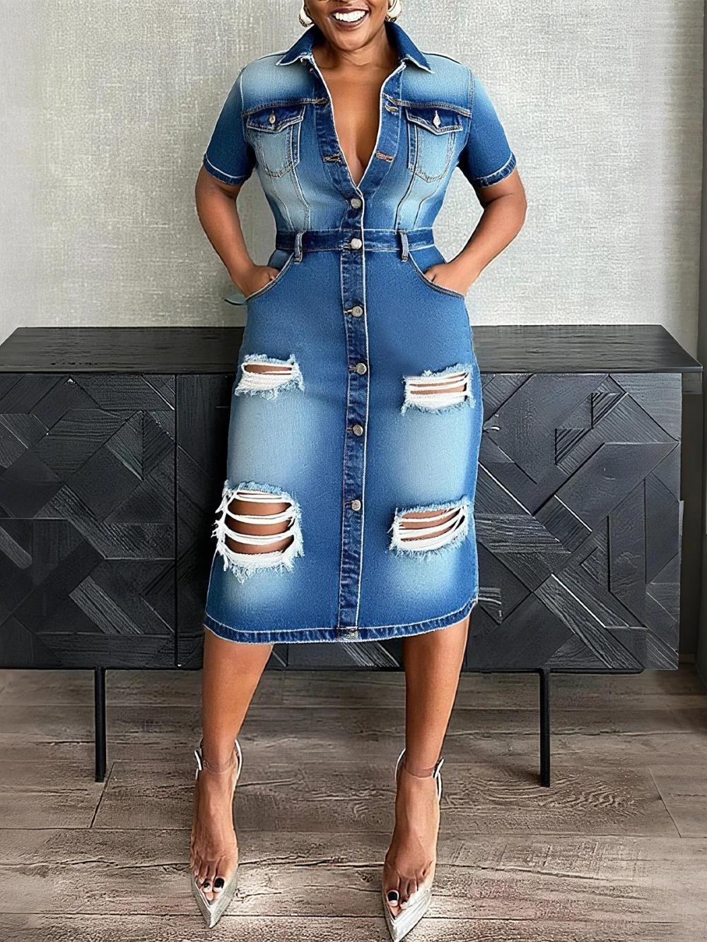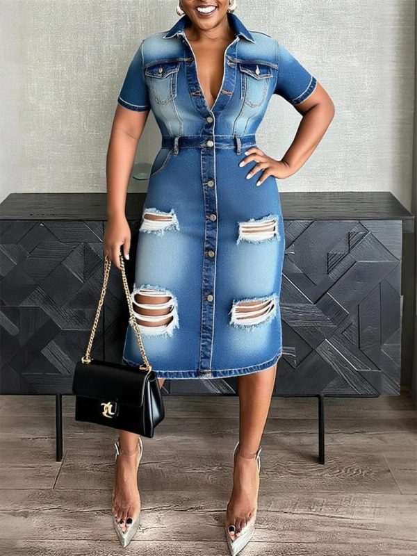 Women Casual Plain Ripped Shirt Collar Knee Length Denim Dress | Denim Dresses