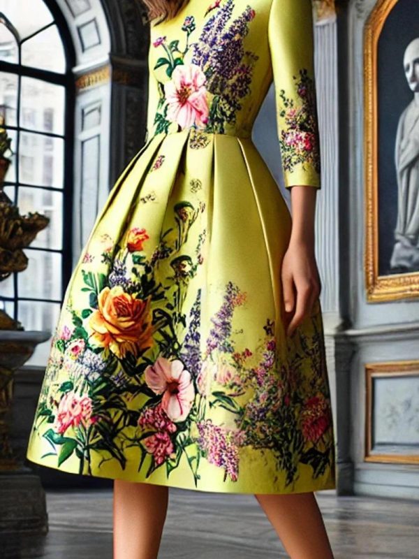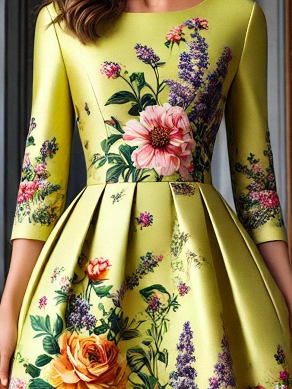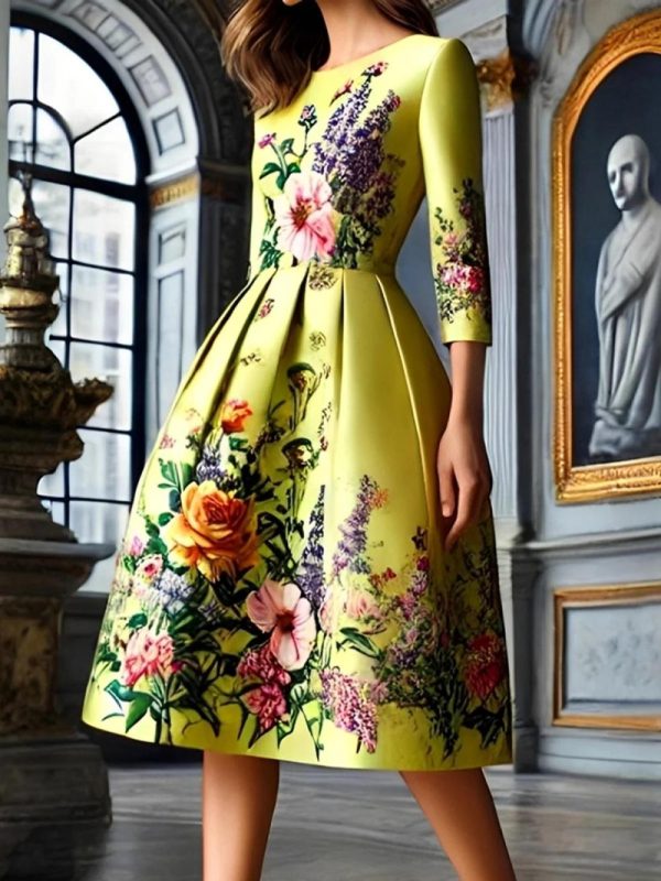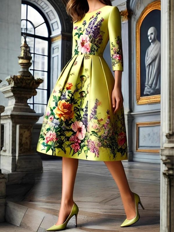 Women Elegant Floral Printing Crew Neck Midi Dress | Floral Dresses