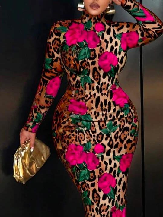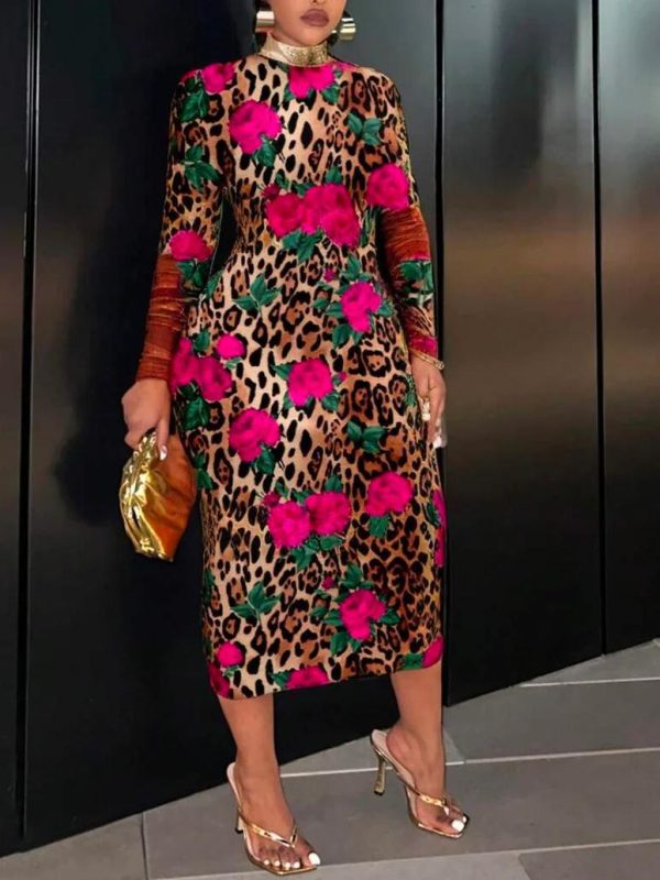 Women Elegant Leopard Tight Regular Sleeve Dress | Floral Dresses