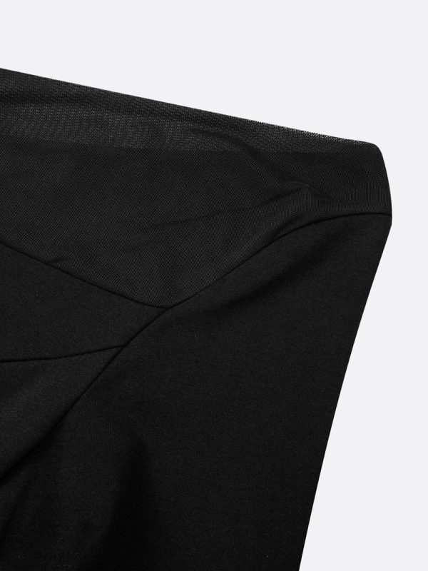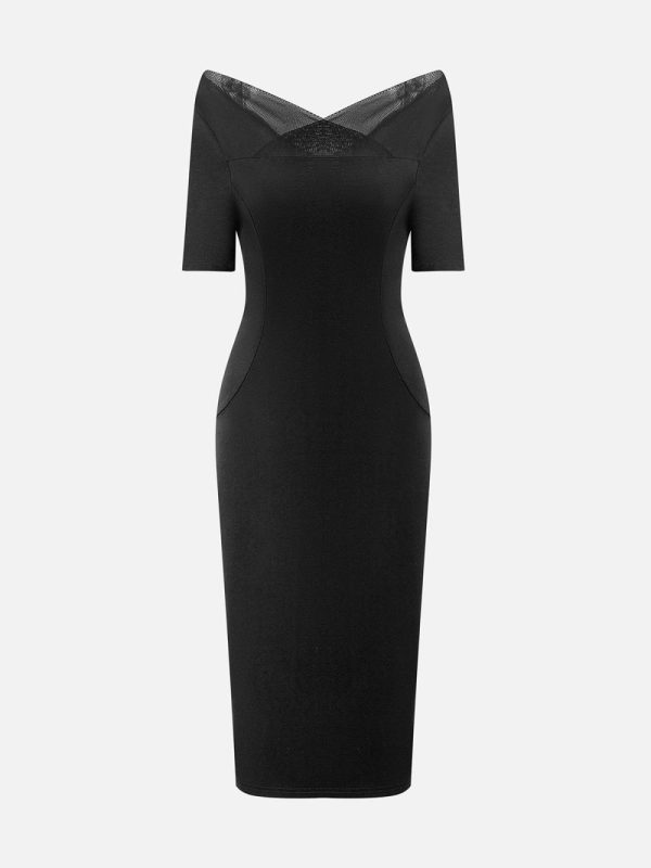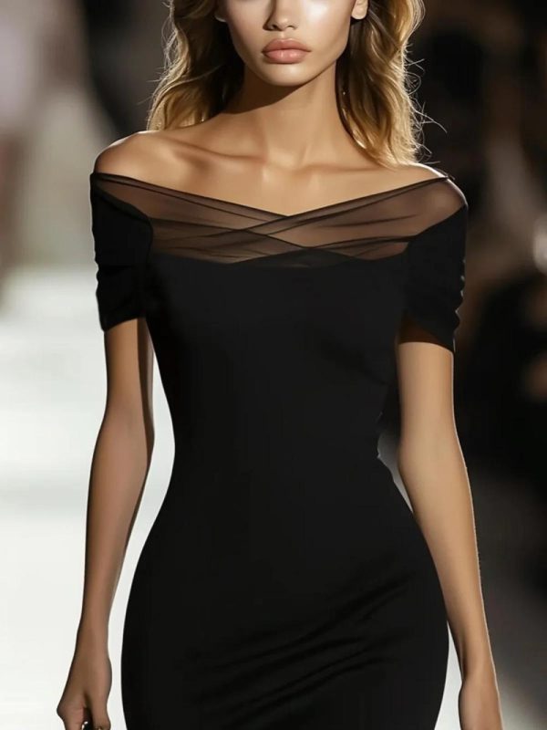 Women Elegant Plain Mesh Split Joint Cold Shoulder Knee Length Dress | Little Black Dresses