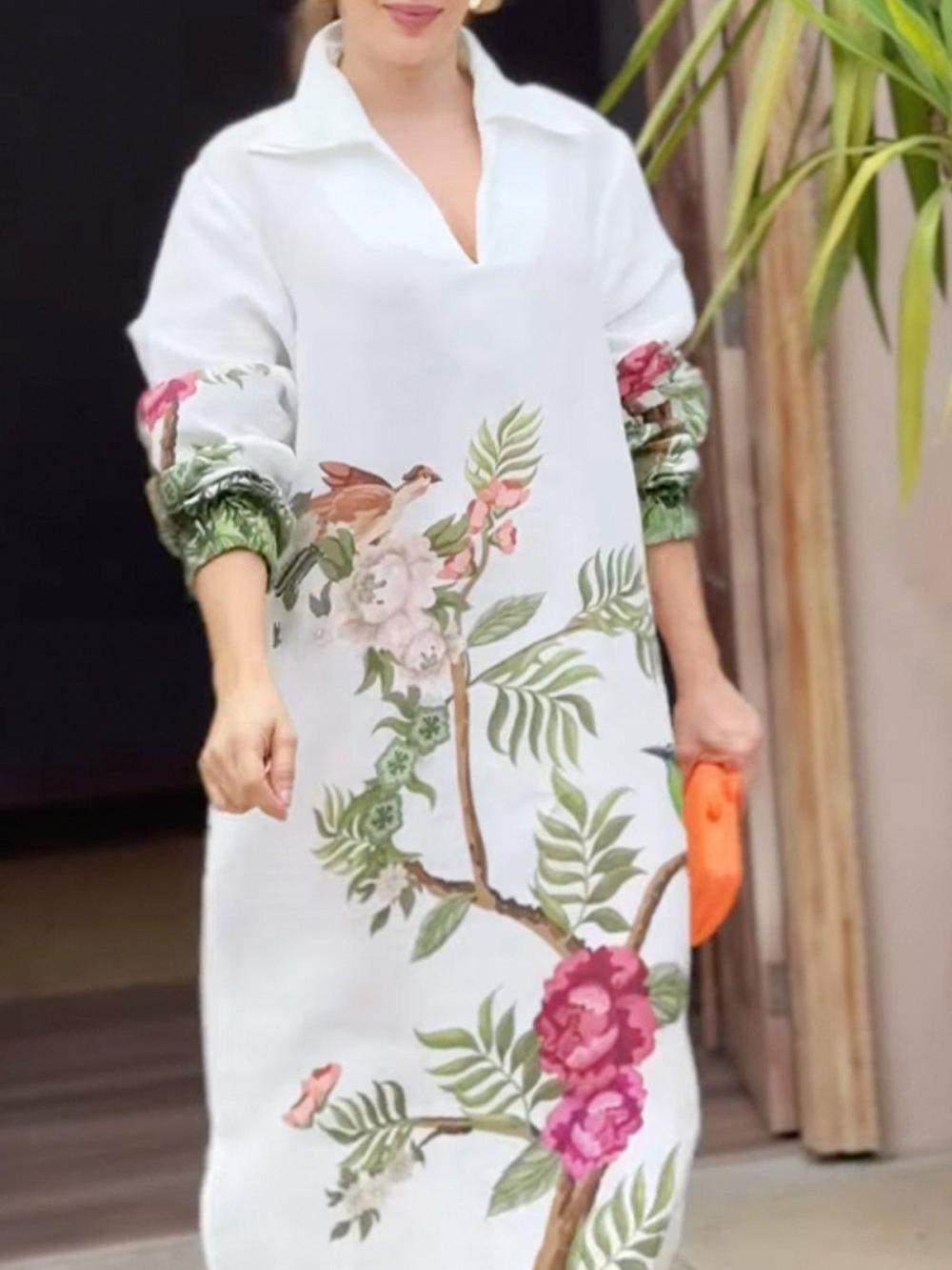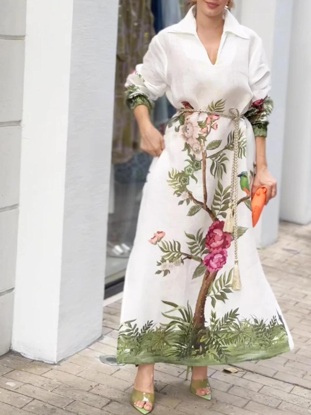 Women Urban Floral Printing Shawl Collar Maxi Dress No Belt | Floral Dresses
